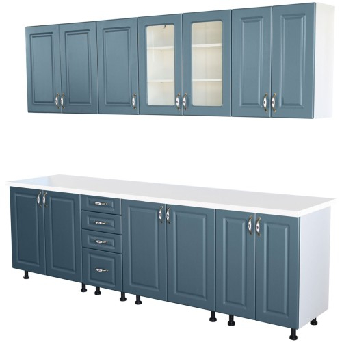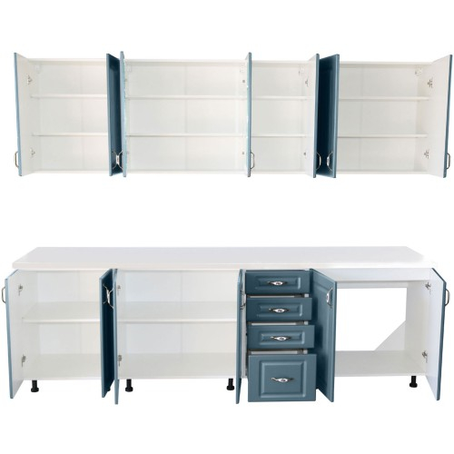 Bucatarie Zebra 260 cm din MDF Albastru cu blat termoizolant alb - Bucatarii set - Bucataria Zebra 2.6 metri MDF verde are corpurile fabricate din PAL melaminat alb cu grosimea de 16 mm, usile sunt fabricate din MDF infoliat albastru cu grosimea de 18 mm,