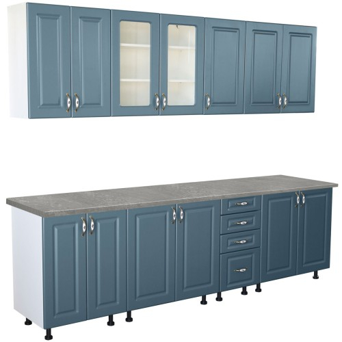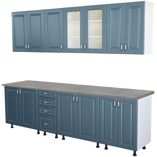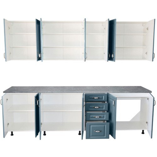 Bucatarie Zebra 260 cm din MDF Albastru cu blat termoizolant gri - Bucatarii set - Bucataria Zebra 2.6 metri MDF are corpurile fabricate din PAL melaminat alb cu grosimea de 16 mm, usile sunt fabricate din MDF albastru infoliat cu grosimea de 18 mm, iar b