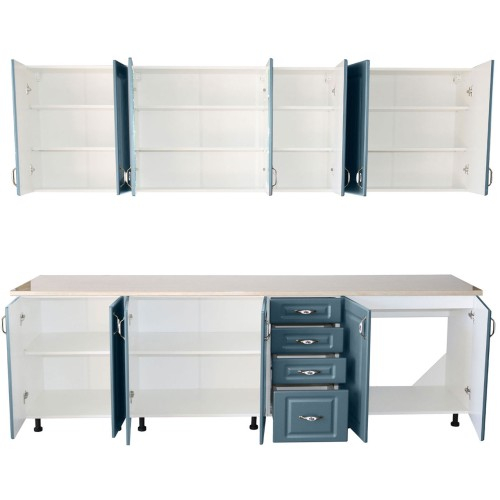 Bucatarie Zebra 260 cm din MDF Albastru cu blat termoizolant marmura travertin - Bucatarii set - Bucataria Zebra 2.6 metri MDF are corpurile fabricate din PAL melaminat alb cu grosimea de 16 mm, usile sunt fabricate din MDF infoliat cu grosimea de 18 mm,