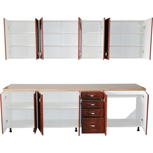 Bucatarie Zebra 260 cm din MDF Cedru frunza cu blat termoizolant crem - Bucatarii set - Bucataria Zebra 2.6 metri MDF are corpurile fabricate din PAL melaminat alb cu grosimea de 16 mm, usile sunt fabricate din MDF infoliat cu grosimea de 18 mm, iar blatu