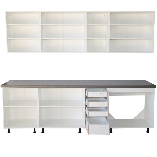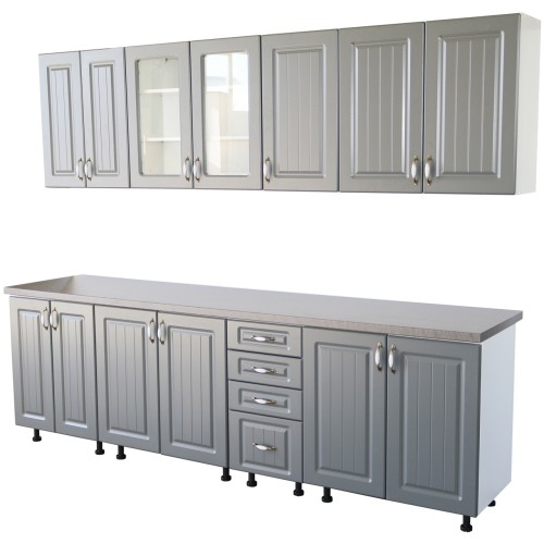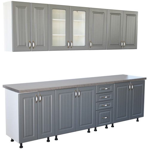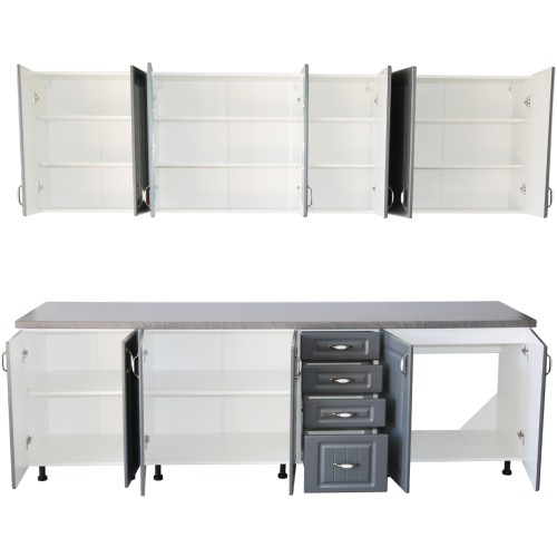 Bucatarie Zebra 260 cm din MDF Gri cu blat gros termoizolant culoare Beton - Bucatarii set - Bucataria Zebra 2.6 metri MDF are corpurile fabricate din PAL melaminat alb cu grosimea de 16 mm, usile sunt fabricate din MDF infoliat cu grosimea de 18 mm, iar