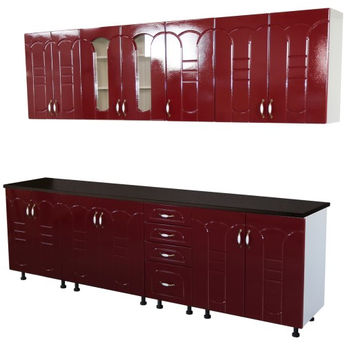 Bucatarie Zebra 260 cm din MDF Rosu Tulip cu blat termoizolant imitatie negru - Bucatarii set - Bucataria Zebra 2.6 metri MDF are corpurile fabricate din PAL melaminat alb cu grosimea de 16 mm, usile sunt fabricate din MDF infoliat cu grosimea de 18 mm, i