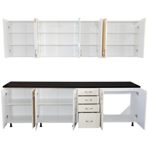 Bucatarie Zebra 260 cm din MDF Vanilie cu blat termoizolant negru - Bucatarii set - Bucataria Zebra 2.6 metri MDF are corpurile fabricate din PAL melaminat alb cu grosimea de 16 mm, usile sunt fabricate din MDF infoliat cu grosimea de 18 mm, iar blatul es