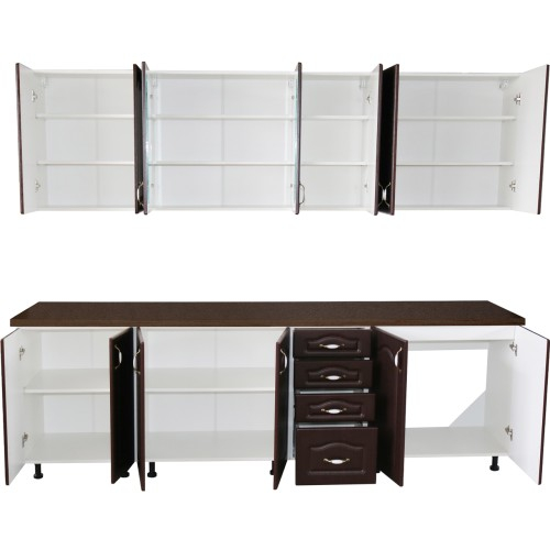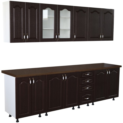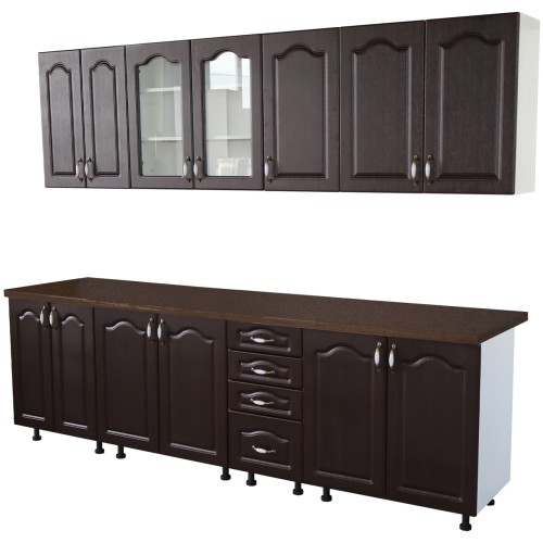 Bucatarie Zebra 260 cm din MDF Wenge cu blat termoizolant negru - Bucatarii set - Bucataria Zebra 2.6 metri MDF are corpurile fabricate din PAL melaminat alb cu grosimea de 16 mm, usile sunt fabricate din MDF infoliat cu grosimea de 18 mm, iar blatul este