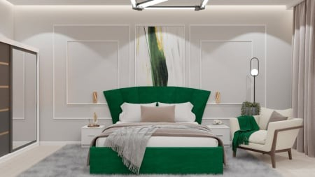 Dormitor Lion cu Pat Tapitat Stofa Verde cu dulap 200*200 usi glisante Antracit&Alb cu oglinda , noptiere si comoda