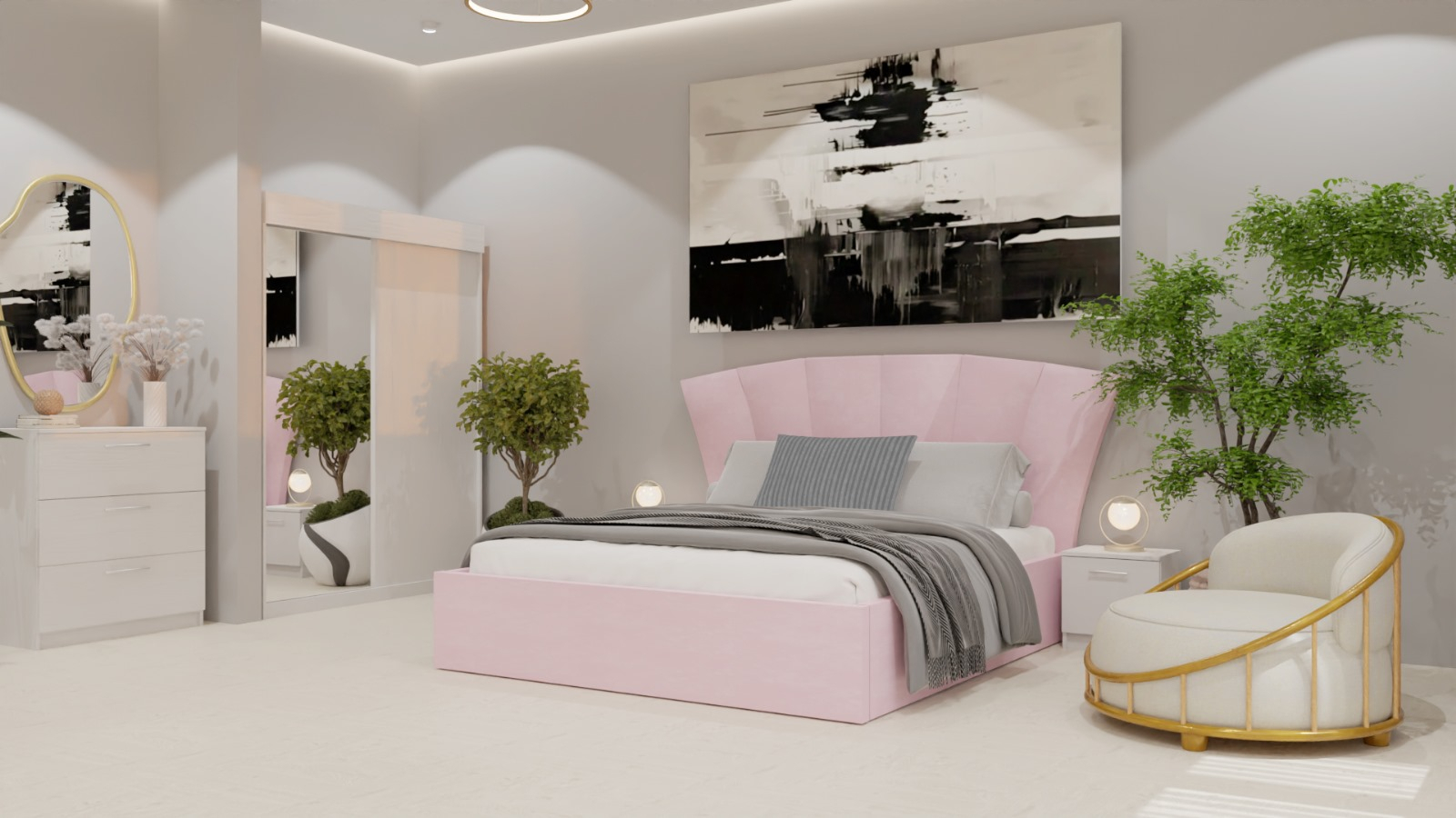 Dormitor Lion Tapitat Roz 2 Usi Alb cu Oglinda