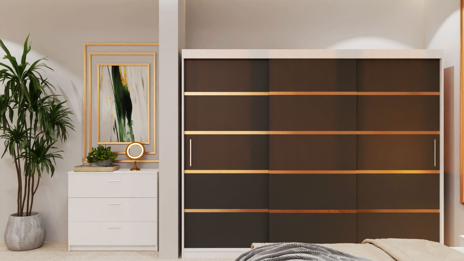 Dormitor Lion Tapitat Stofa Verde cu dulap 250*200 usi glisante Alb&Antracit, noptiere si comoda