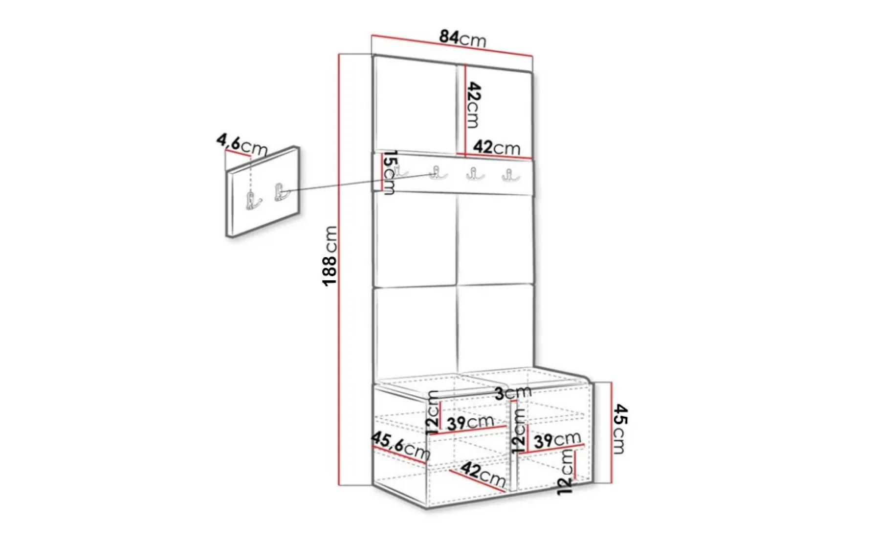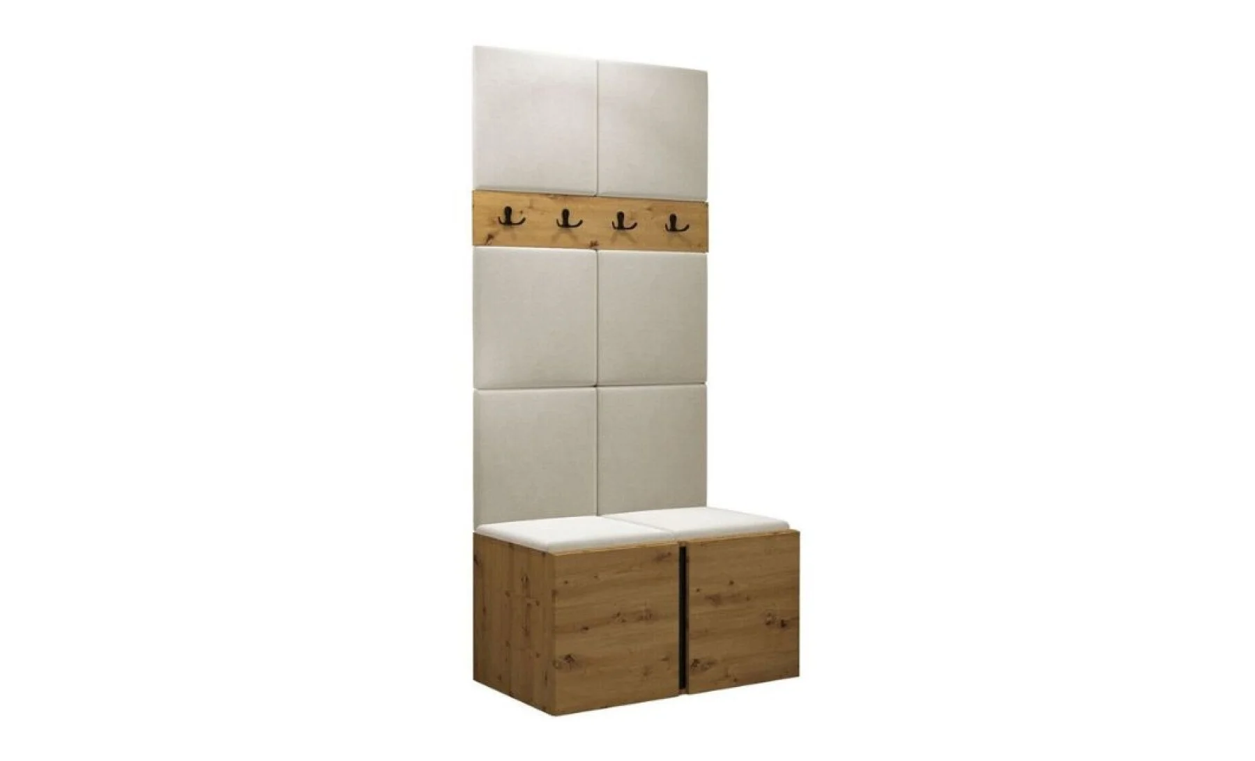 Cu spații generoase de depozitare și plăci tapitate de înaltă calitate, acest cuier tapitat reprezintă alegerea ideală pentru cei ce doresc să aducă eleganță și eficiență în holul lor. Setul de hol este perfect atât pentru depozitarea obiectelor, cât și pentru agățarea hainelor în zona tapitată. Mobilierul este compus din panouri tapitate și dulapuri de depozitare.