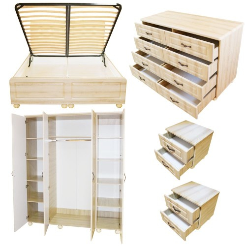 Dormitor Dynasty MDF Sonoma cu pat pentru saltea 140x200 cm - Dormitoare Set - Dormitorul Dynasty este o alegere eleganta si practica pentru camera dvs. Dormitorul este compus din dulap cu 4 usi, comoda cu 8 sertare, pat cu somiera metalica rabatabila pen