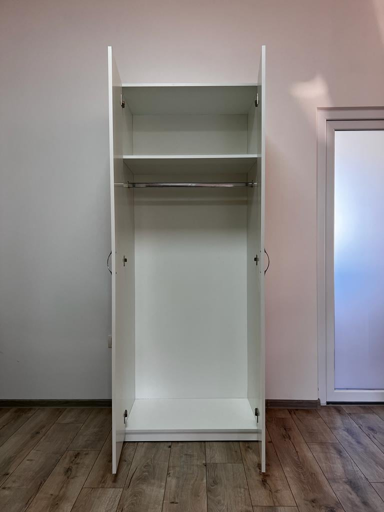 | Dulap 2 usi Alb polita fixa si bara Dimensiuni : 200 X 80 X 50cm Culoare : Alb Material : PAL Produsul contine feroneria necesara si schema de montaj ! | ||