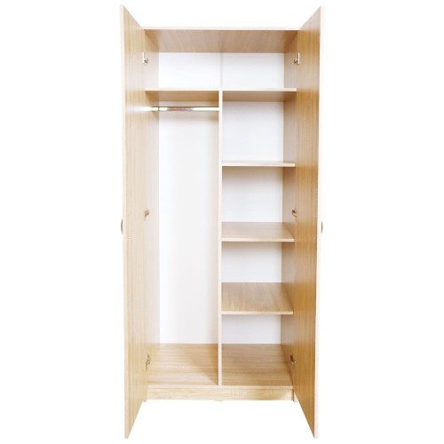 Dulap Soft 2 usi cu despartitor sonoma - Dulapuri - Descriere Dulap Soft cu 2 usi fabricat din PAL Melaminat cu grosimea de 16 mm cires, manere din plastic cu filet metalic, 5 spatii de depozitare cu polite si 1 spatiu cu bara de haine pentru umerase, pic