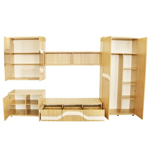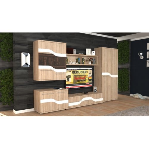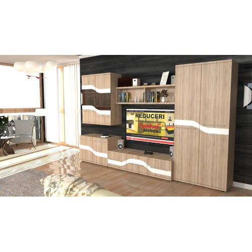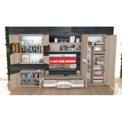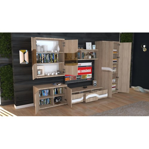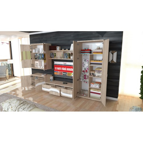 Biblioteca Sigma reprezinta o alegere practica si moderna datorita multiplelor spatii de depozitare. Biblioteca este compusa dintr-un dulap cu 2 usi pline cu suport de umerase si 5 spatii de depozitare, o comoda TV cu 3 sertare spatioase, un suspendat cu