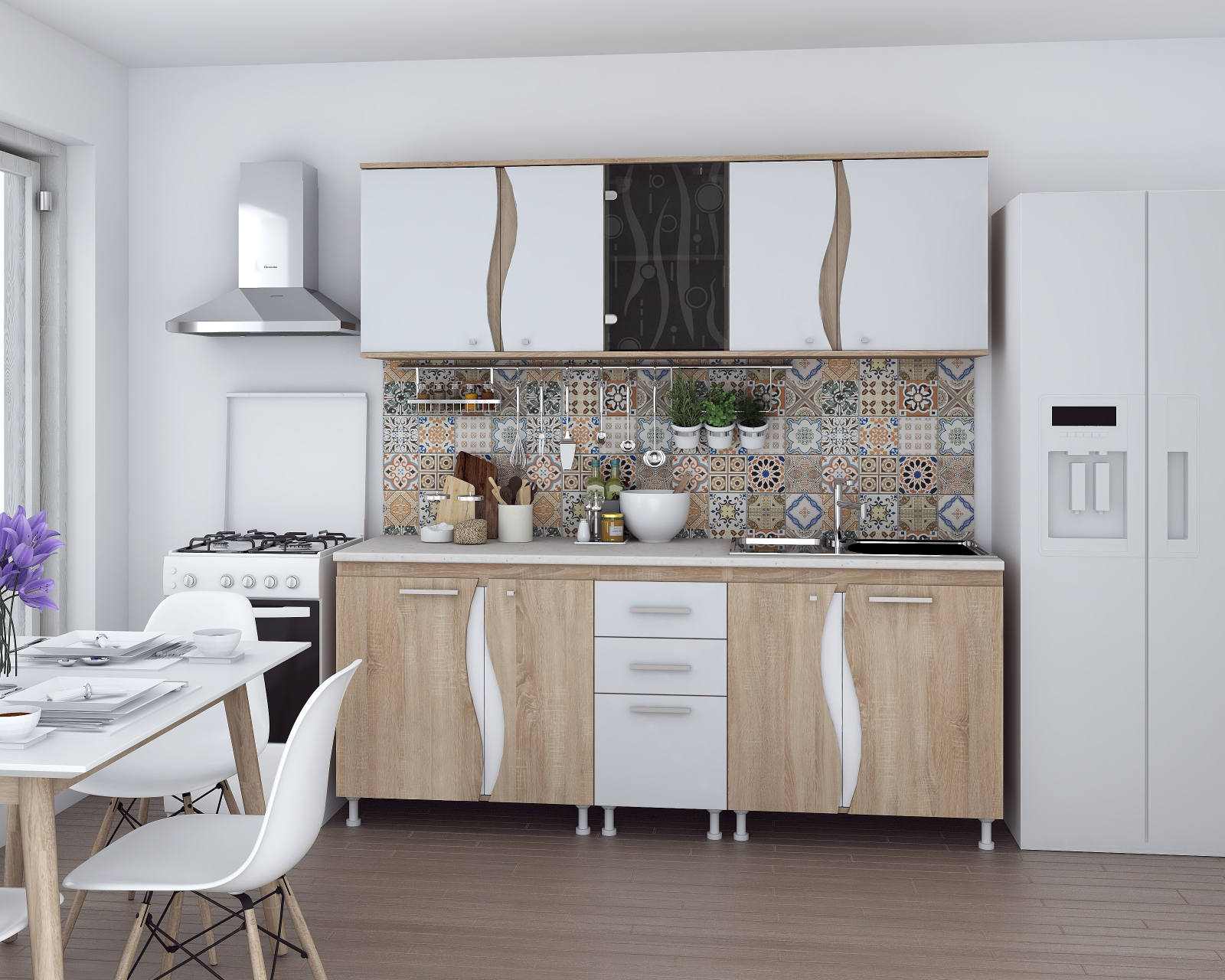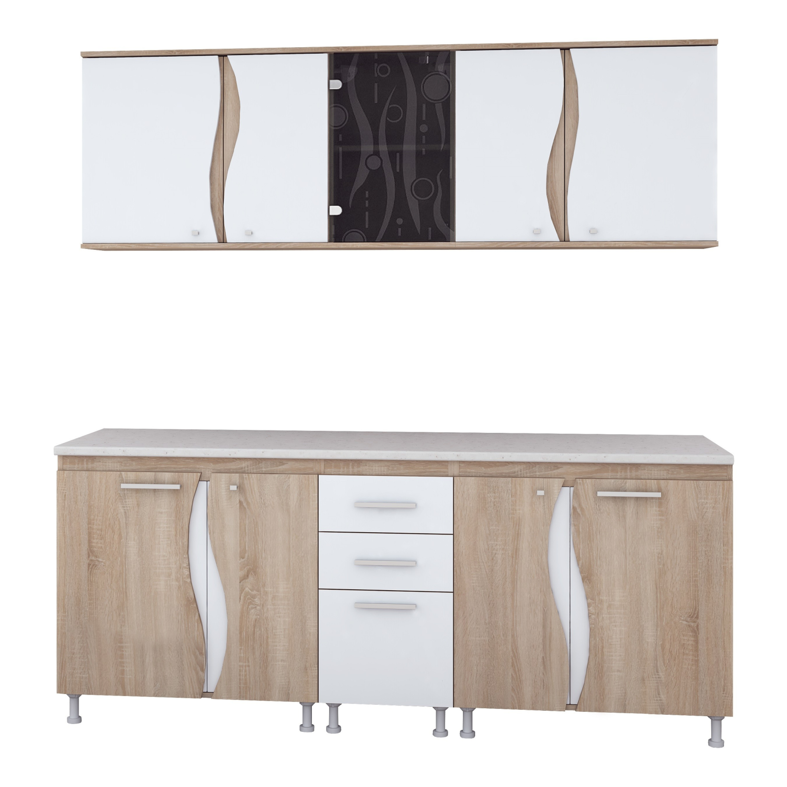 ● Bucataria este in 2 nuante ( PAL Sonoma si PAL Alb ). Partea Inferioara este formata din 3 corpuri ( corp de 80cm cu 2 usi, corp de 40cm cu 2 sertare si o usa si masca de chiuveta ) iar partea superioara se compune din ( 2 corpuri de 80cm si un corp de 40cm cu usa geam ).