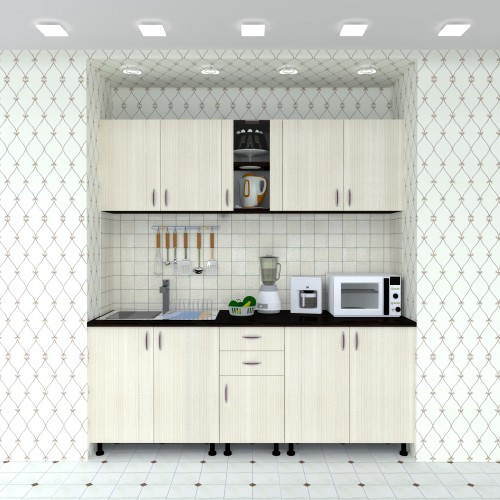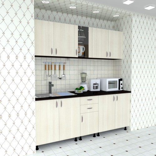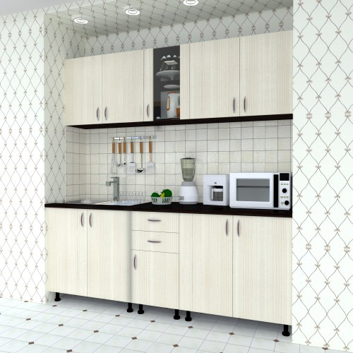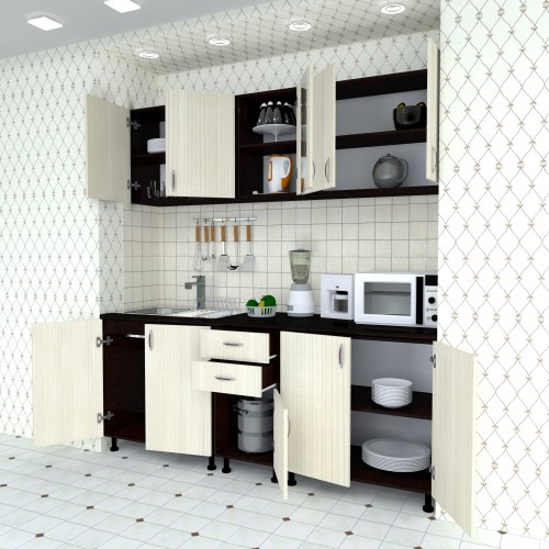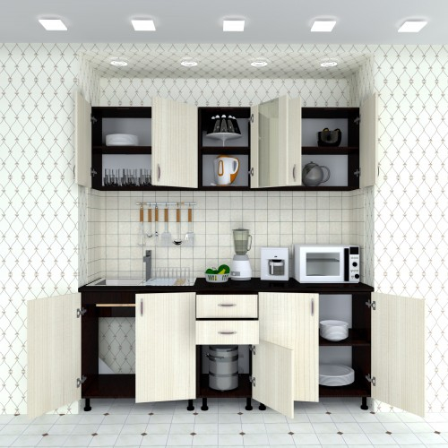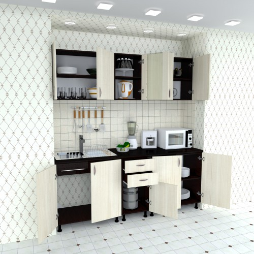 Bucatarie Sofia / Fronturi PAL melaminat - Varianta 1 (2 m) Culori: Corpuri wenge cu fronturi ladin si blat melaminat culoare stejar ciocolata. Materiale folosite: Carcasa din PAL melaminat, fronturi din PAL, sticla, manere plastic, balamale metal, picioa