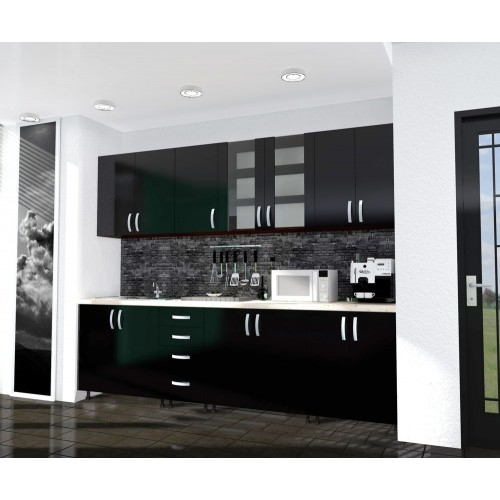 Bucatarie Zebra 2.6 metri wenge negru Bucataria Zebra 2.6 metri wenge negru are corpurile fabricate din PAL melaminat wenge cu grosimea de 16 mm, usile sunt fabricate din PAL cu grosimea de 18 mm, iar blatul are marmura.