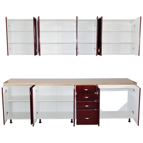 Bucatarie Zebra 260 cm din MDF Rosu Simplu cu blat termoizolant crem - Bucatarii set - Bucataria Zebra 2.6 metri MDF are corpurile fabricate din PAL melaminat alb cu grosimea de 16 mm, usile sunt fabricate din MDF infoliat cu grosimea de 18 mm, iar blatul