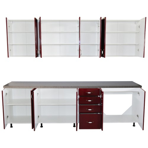 Bucatarie Zebra 260 cm din MDF Rosu Simplu cu blat termoizolant gri - Bucatarii set - Bucataria Zebra 2.6 metri MDF are corpurile fabricate din PAL melaminat alb cu grosimea de 16 mm, usile sunt fabricate din MDF infoliat cu grosimea de 18 mm, iar blatul