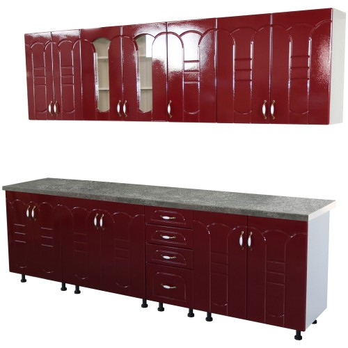 Bucatarie Zebra 260 cm din MDF Rosu Tulip cu blat termoizolant imitatie gri - Bucatarii set - Bucataria Zebra 2.6 metri MDF are corpurile fabricate din PAL melaminat alb cu grosimea de 16 mm, usile sunt fabricate din MDF infoliat cu grosimea de 18 mm, iar