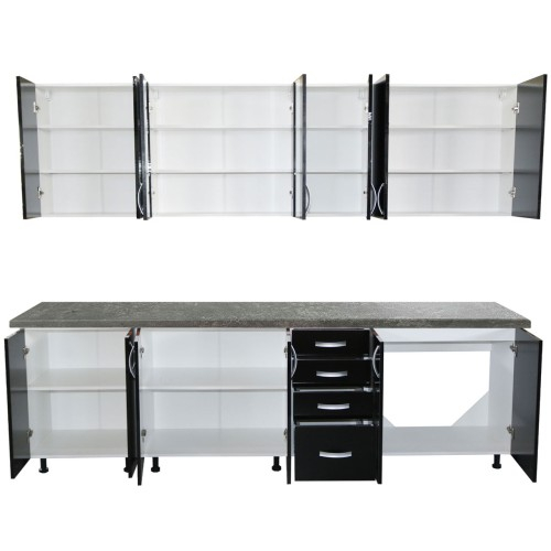Bucatarie Zebra 260 cm din PAL Negru cu blat termoizolant gri - Bucatarii set - Bucataria Zebra 2.6 metri MDF are corpurile fabricate din PAL melaminat alb cu grosimea de 16 mm, usile sunt fabricate din MDF infoliat cu grosimea de 18 mm, iar blatul este t