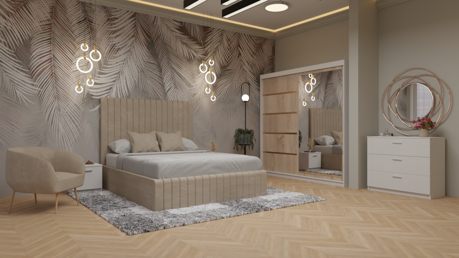 Dormitor Dublin cu Pat Tapitat cu Dressing 200*200 usi glisante Alb&Sonoma cu oglinda , noptiere si comoda