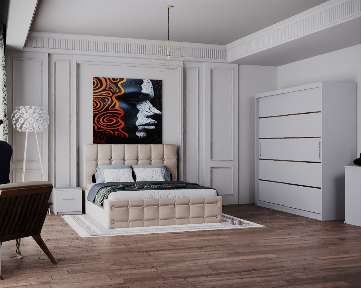 Dormitor King cu Pat Tapitat Stofa Bej cu dulap 200*200 usi glisante Alb, noptiere si comoda