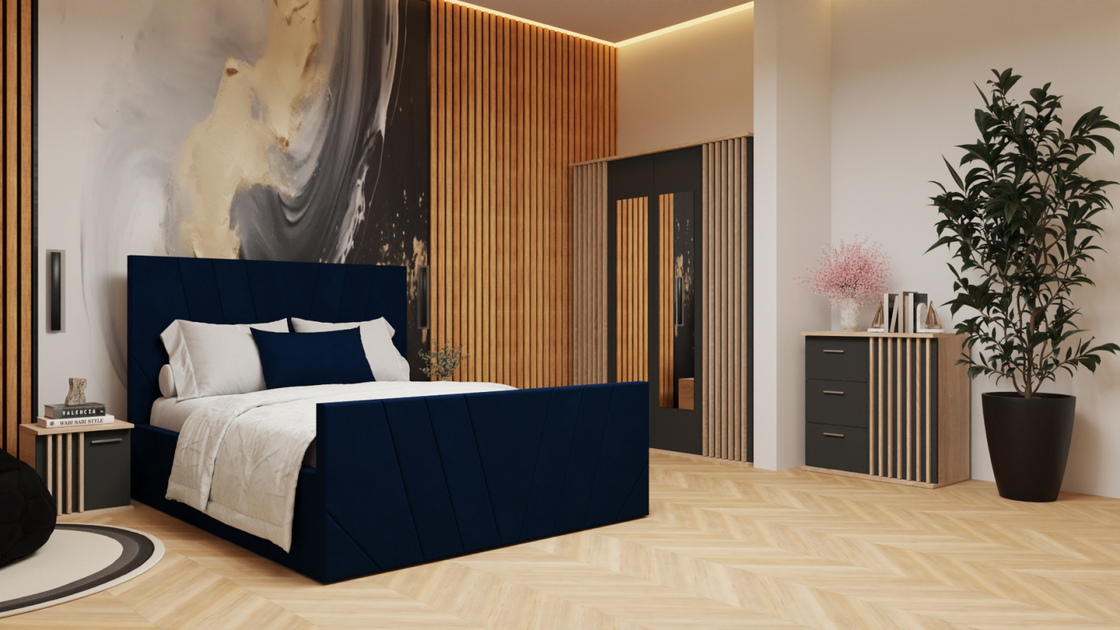 Dormitor: Supreme Cu Pat Tapitat Albastru